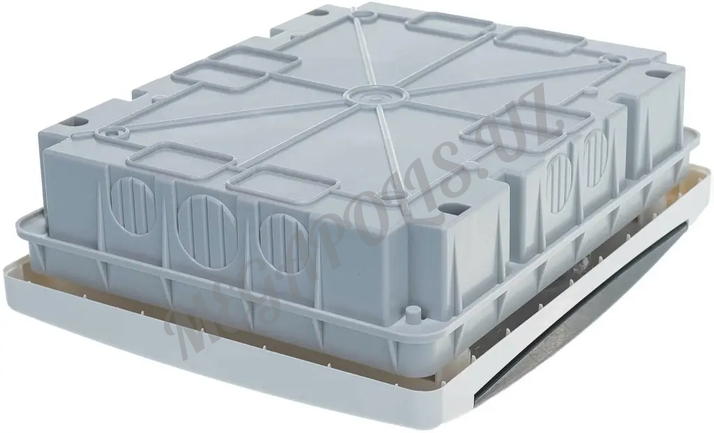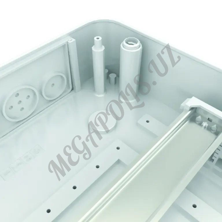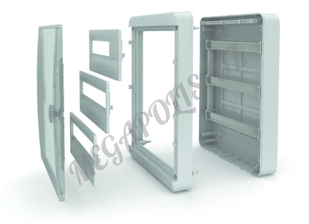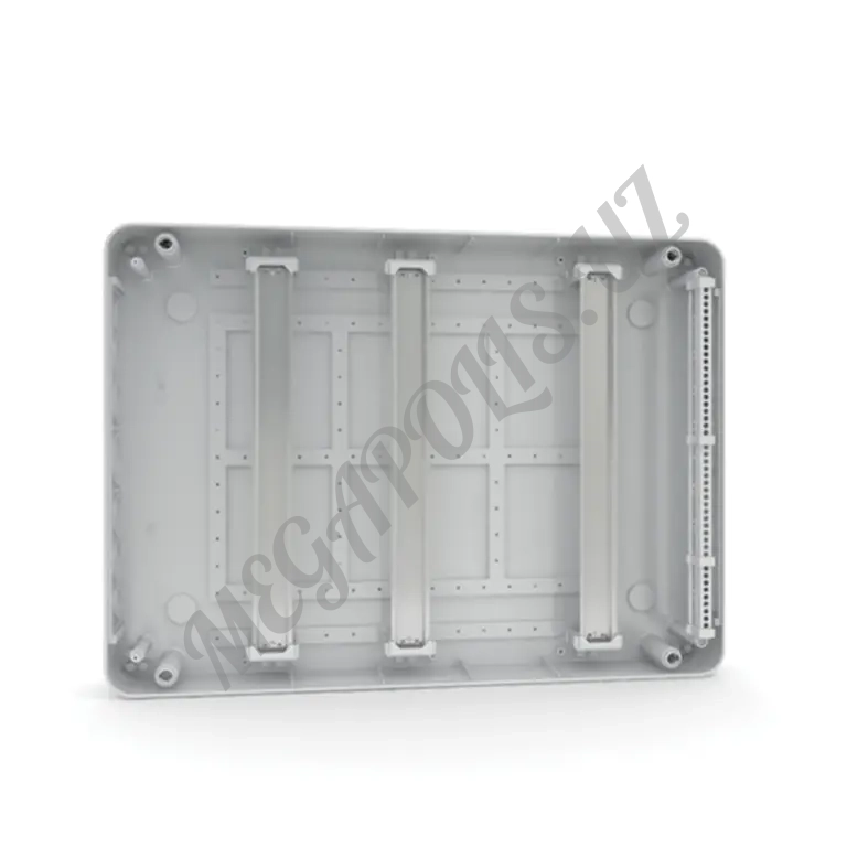 - на днище и боковых сторонах имеются выдавливаемые отверстия — крышка щита имеет выдавливаемые элементы, для изменения числа устанавливаемых модулей